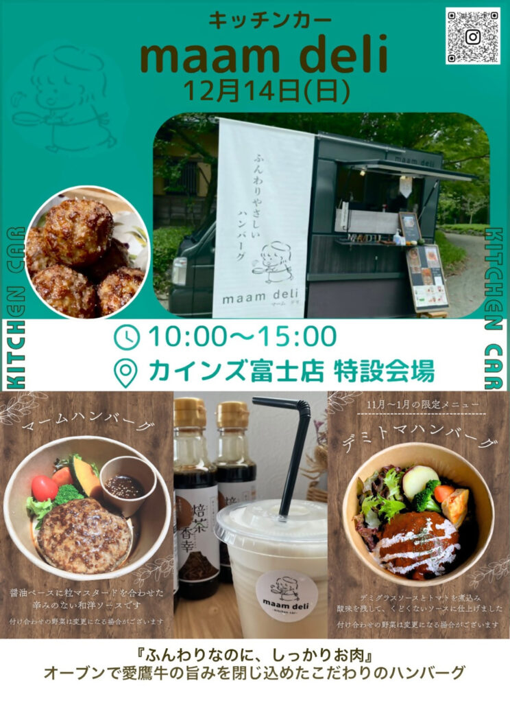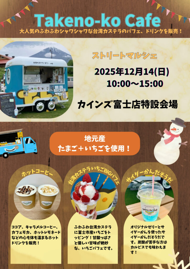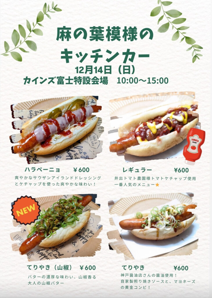 | 出店キッチンカー | ①maam deli 静岡「あしたか牛」を使用した、ふんわり優しいハンバーグ 地元食材:お米、ほうじ茶 ②16cafe グルテンフリー食品や無添加食材など、健康にやさしいお茶漬けやシフォンケーキ 地元食材:地元野菜 ③麻の葉模様のキッチンカー 大きなソーセージをコンパクトなパンでサンドした、ちょうどいいボリューム感のホットドック 地元食材:トマト、醤油 ④あおいろ たくさんのフレーバーをご用意、揚げたてでサクもち食感のチュロス 地元食材:たまご ⑤takeno-ko café 大人気のふわふわシャワシャワな台湾カステラのパフェ、ドリンク 地元食材:たまご、いちご |