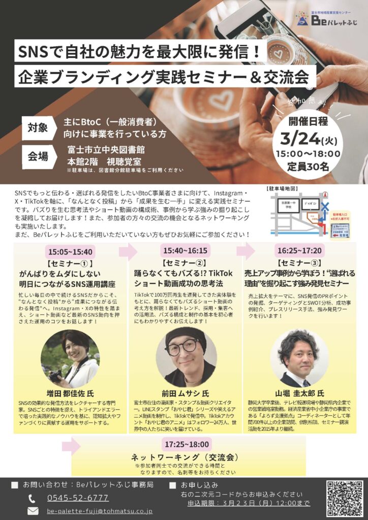 | 主催・問い合わせ先 | 富士地域産業支援センターBeパレットふじ TEL:0545-52-6777 Mail:be-palette-fuji@tohmatsu.co.jp |