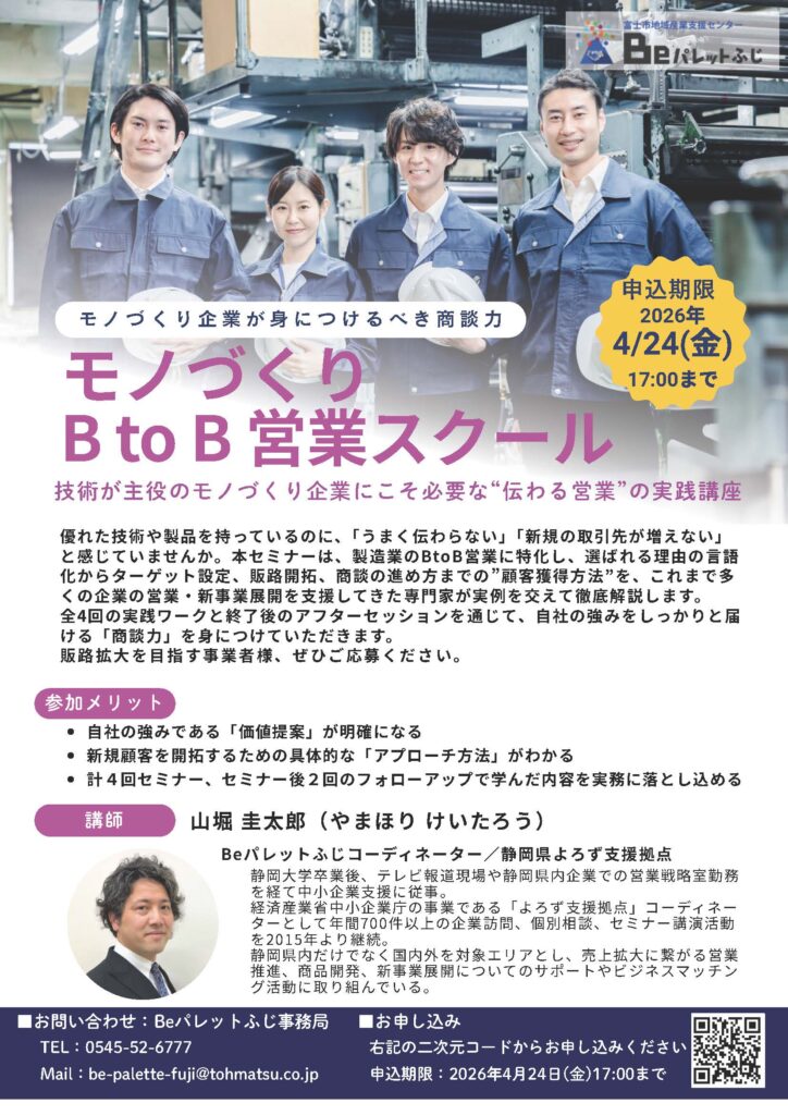 | 参加条件 | 1. 原則、全4回のセミナーにすべて参加できる方 2.富士市「ものづくり力交流フェア2027(仮称)(2027年1月開催予定)」の出展に向けて取り組む意思のある方 3. 自社の強みや課題について、セミナー内のワークに積極的に参加でき、 他の参加者と積極的に交流し学ぶ姿勢がある方 4. セミナーで共有された他社の情報を外部に漏らさないことをお約束できる方 |